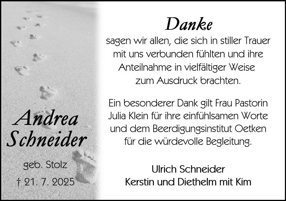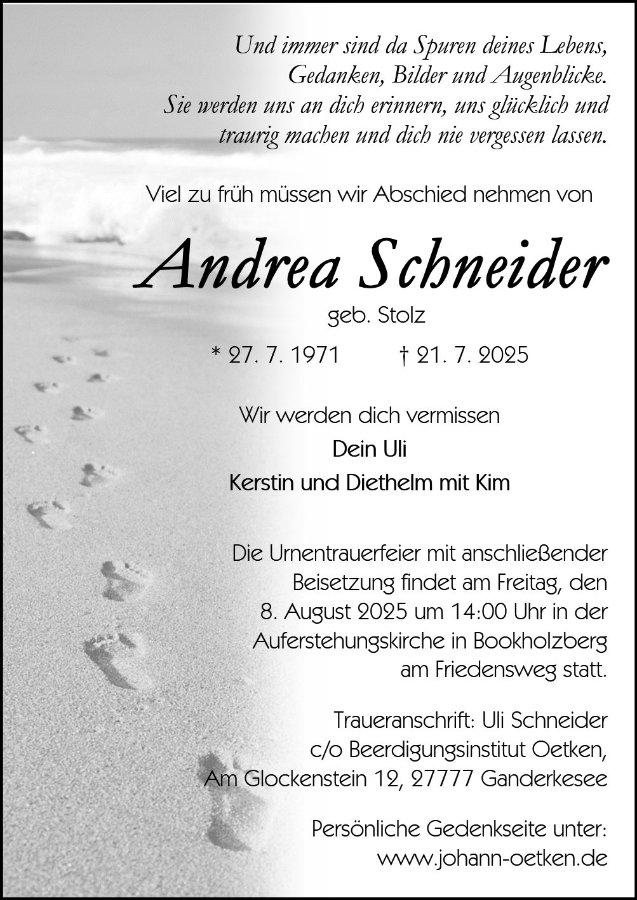 wir wünschen dir von Herzen ganz viel Kraft für die kommende Zeit. Mögen dich die Erinnerungen an die gemeinsamen Jahre mit Andrea tragen und dir Trost spenden.
